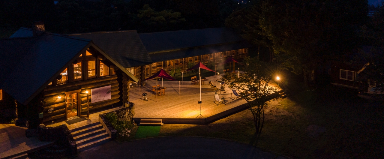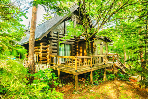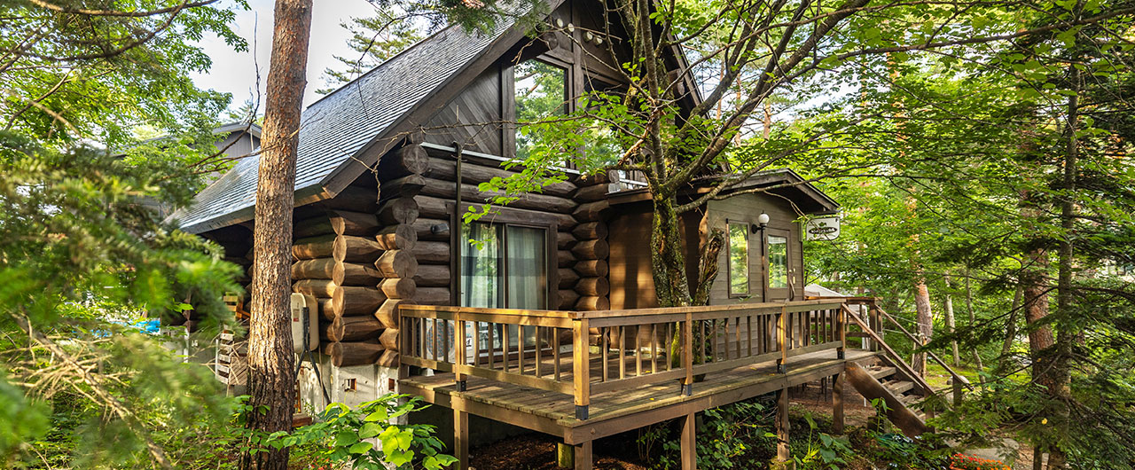ルポゼ白馬のログホテル棟は、木の温もりに包まれた平屋のカナディアンログハウス。