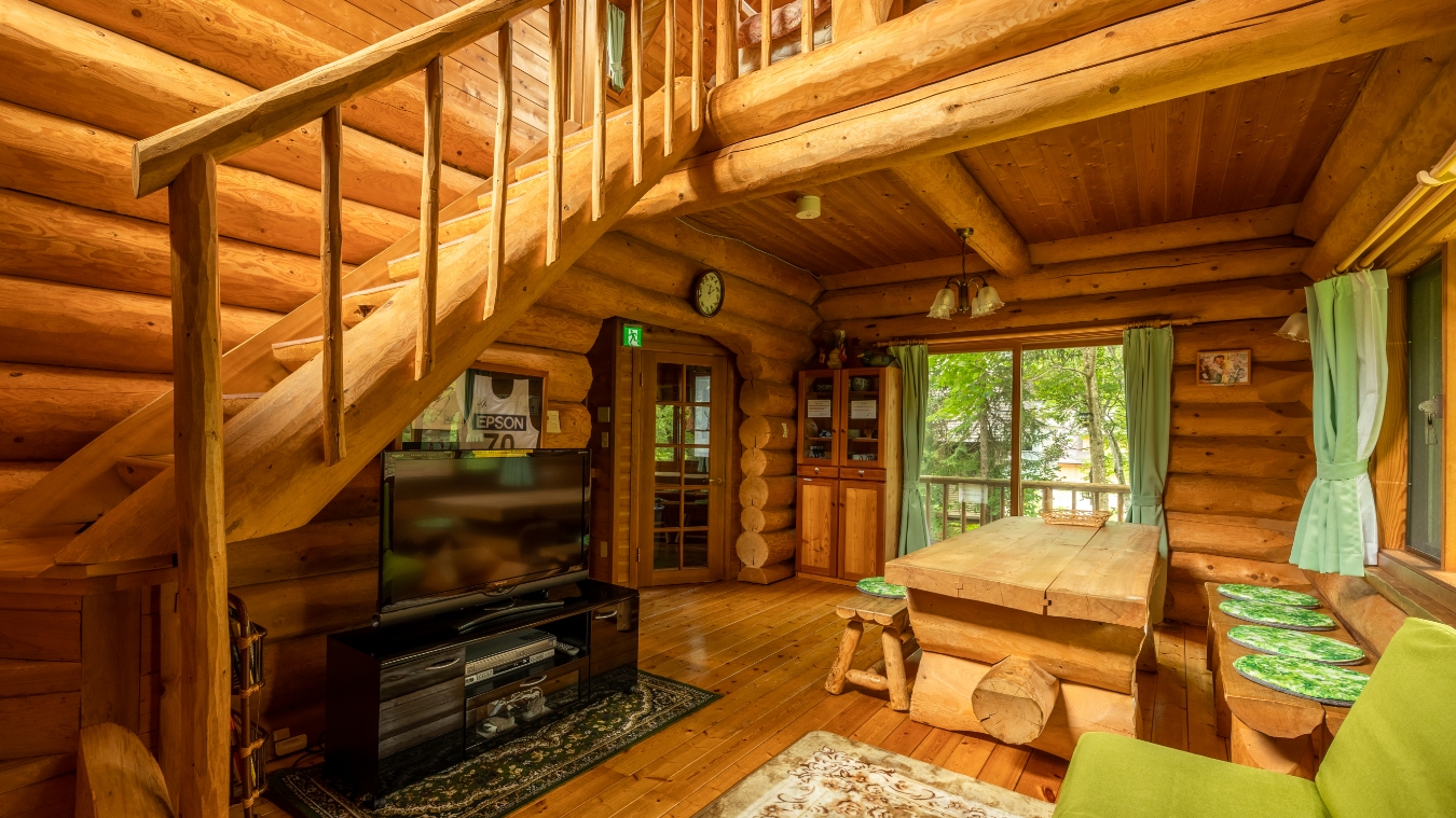 ルポゼ白馬のログホテル棟は、木の温もりに包まれた平屋のカナディアンログハウス。